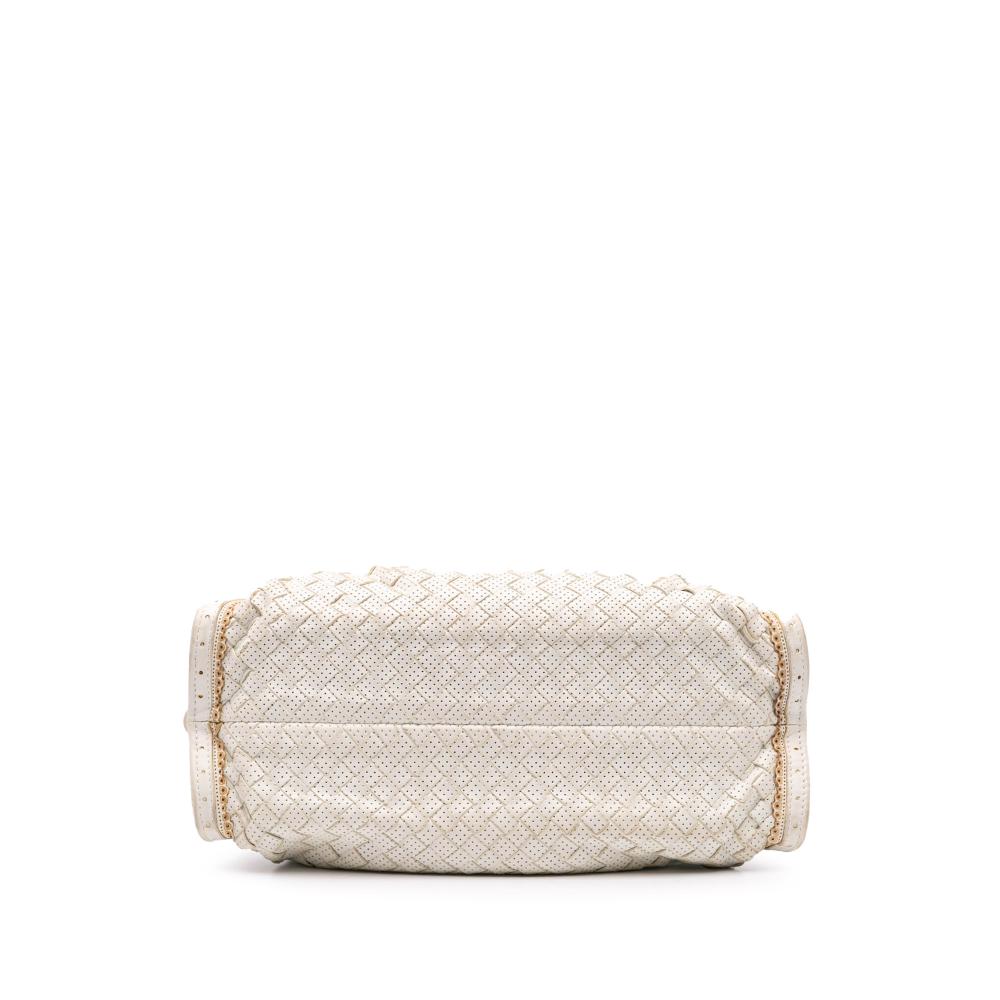 This shoulder bag features a woven and perforated leather body, rolled straps, an open top, and interior zip and slip pockets. It carries a B+ condition rating.Exterior Bottom stained with Other. Exterior Corners Worn. Exterior Front Creased. Exterior Handle Discolored. Exterior Handle stained with Other. Interior Lining stained with Pen Mark. Practical Attachment Rusty/Tarnished. Exterior Top stained with Other. Zipper Rusty/Tarnished. Dimensions:Length 31cmWidth 13cmHeight 17cmShoulder Drop 19cmOriginal Accessories: This item has no other original accessories.Serial Number: 152673v09109000Color: WhiteMaterial: Leather x Calf
